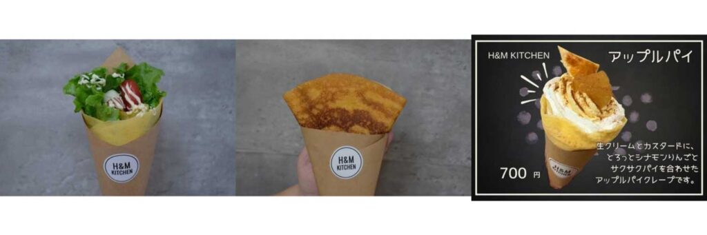 シュガーバタークレープ 600円 / アップルパイ 700円 / 宇治抹茶クレープ 700円 / いちごショートケーキクレープ 700円 / アイスコーヒー 400円 / コーヒーゼリーオレ 600円