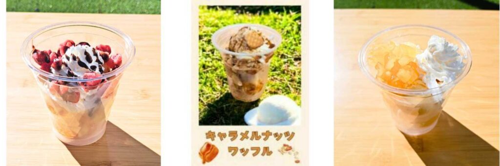 りんごホイップワッフル 600円 / キャラメルナッツワッフル 600円 / あんバターホイップワッフル 600円 / さつまいもホイップワッフル 600円 / コーヒー 400円 / チョコ抹茶ラテ 400円 / イチゴソーダ 400円