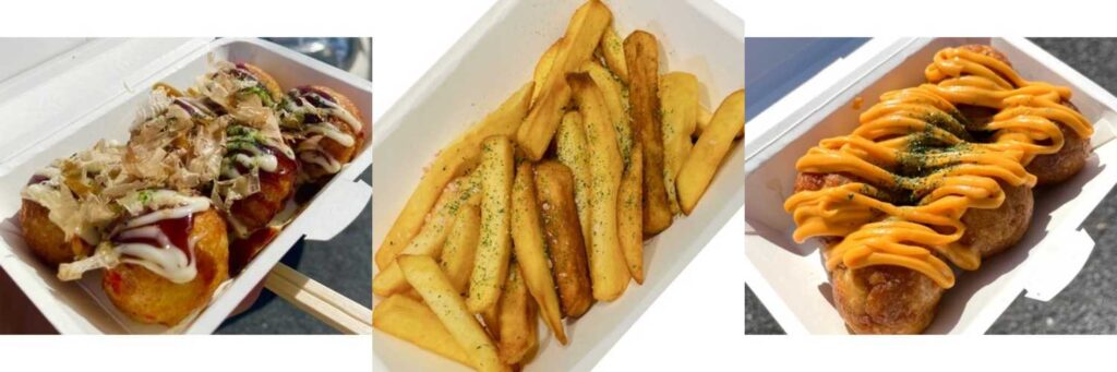 ソースポテト 400円 / 岩塩たこ焼き 600円 / 明太マヨたこ焼き 700円 / ダブルチーズたこ焼き 800円 / ペットボトルドリンク 150円 / チューハイ 500円 / 生ビール(缶) 600円